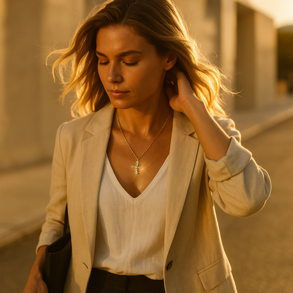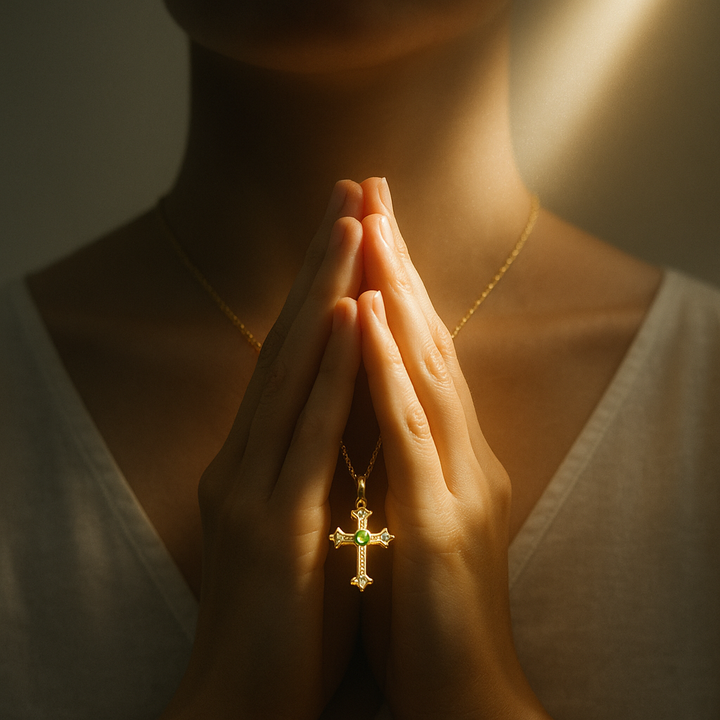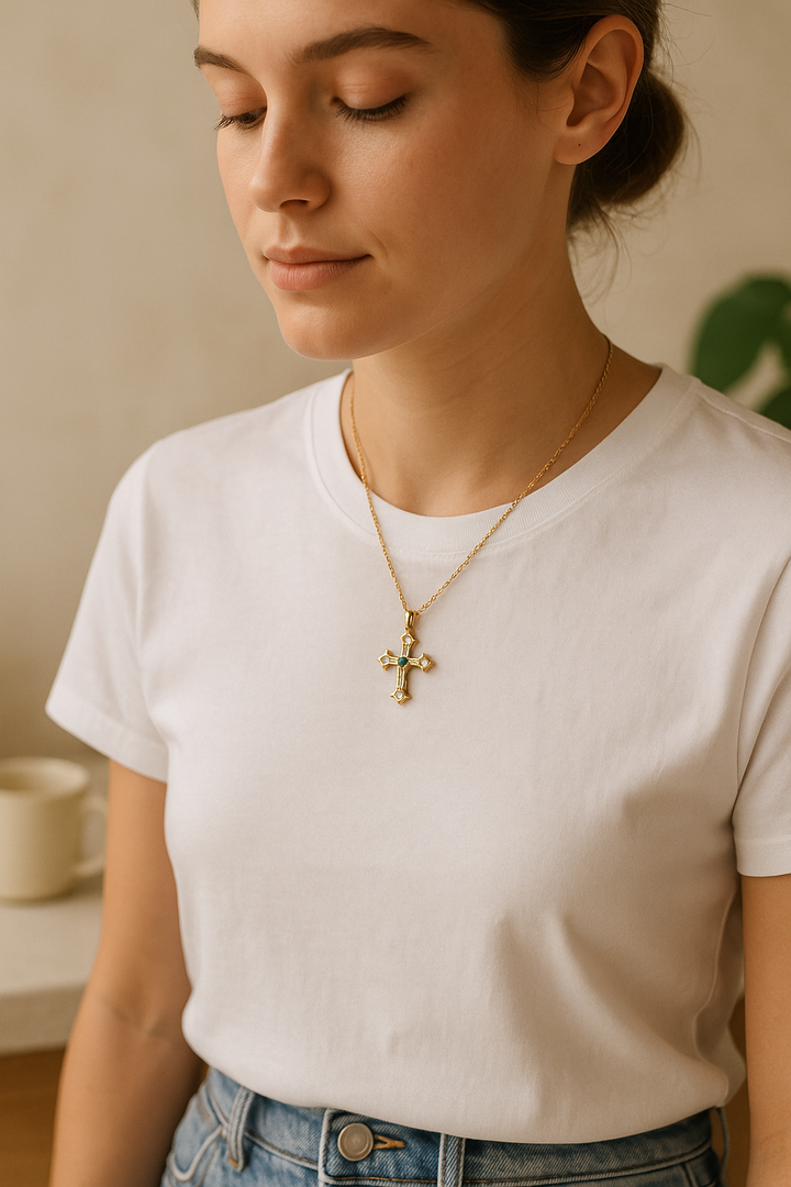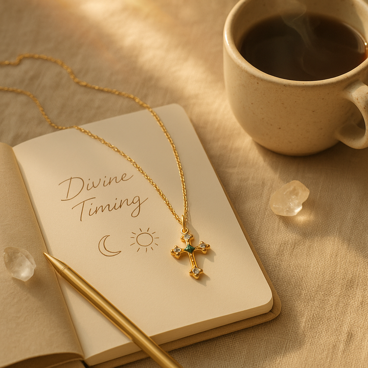 The Manifestor’s Cross grounds your desires into daily action. Crafted in lasting 14k gold and set with white zirconia and citrine or emerald, this piece acts as your ritual anchor for clarity, confidence, and divine timing.
